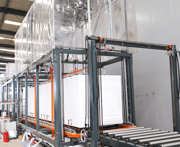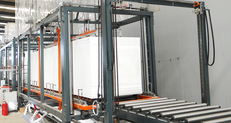 EPS大顆粒在大模內模塑成1m×1.2m×6m或其它規格的大板塊,其過程分為充模、蒸汽加熱、冷卻、脫模等階段。模塑一塊大板的時間一般為10分鐘。